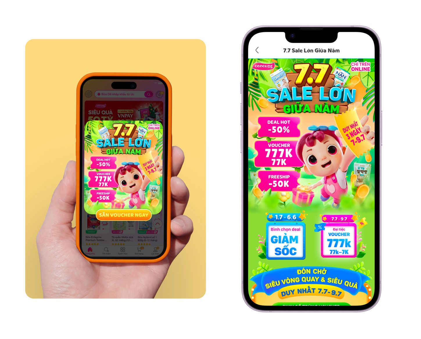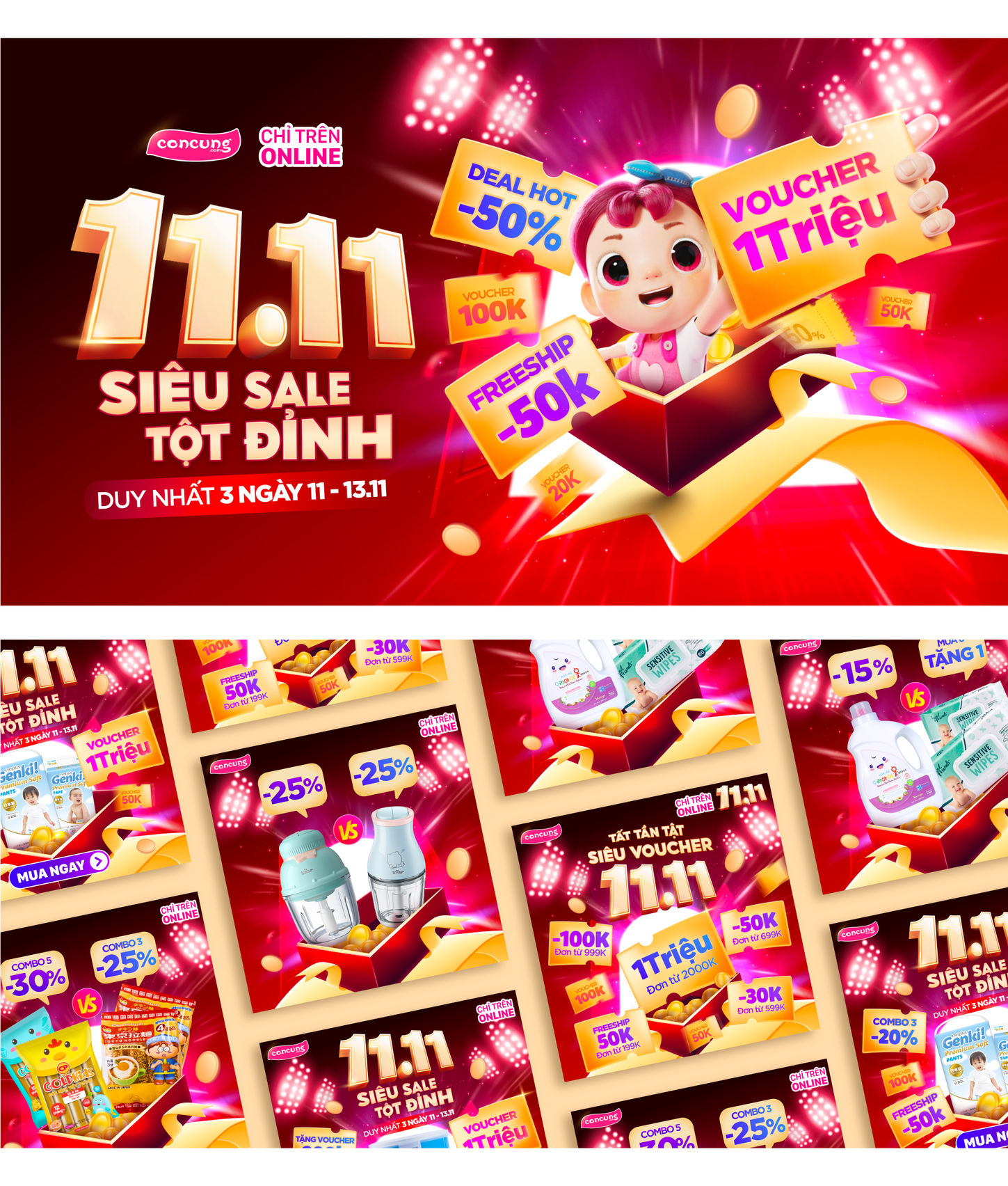 Double Day is Con Cung’s monthly online sales series, running on dates like 6.6, 7.7, and 8.8, each with a unique seasonal or festive theme. The campaigns target modern Gen Z moms with visuals that are vibrant, playful, and emotionally engaging.